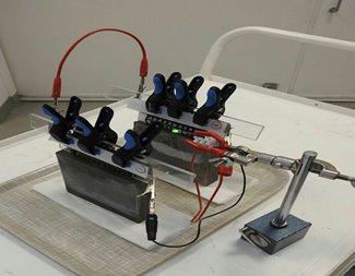 The battery is essentially a three-layered sandwich of concrete. The outside layers are reinforced with a mesh of coated carbon fiber acting as electrodes; iron on the anode side, and nickel for the cathode. “Exactly the same principle as the Thomas Edison battery,” said Zhang. “It’s a very robust system and can tolerate over-charging and over-discharging and have a very long service life. At the same time, the battery capacity is low, but since we have a really huge volume of concrete that could be used, it’s not a disadvantage for concrete batteries.”